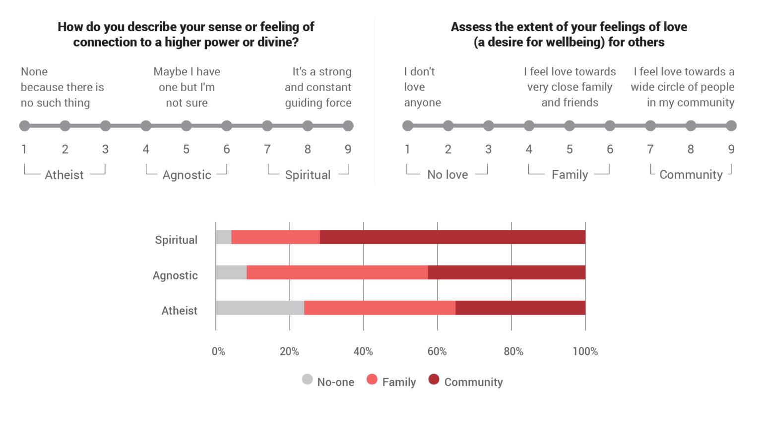 • Aquellos que son espirituales aman y cuidan del bienestar de un círculo más amplio de personas, mientras que aquellos que son ateos tienen cinco veces más probabilidades de no amar a nadie.
