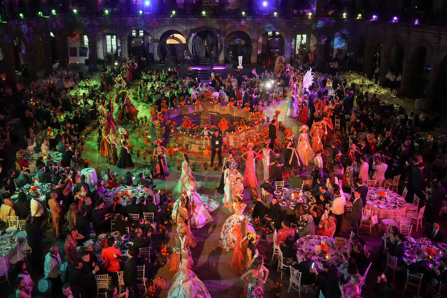Las 128 concursantes del certamen de belleza desfilaron por el patio central del Colegio de las Vizcaínas en el Centro Histórico de Ciudad de México, en una gala benéfica temática del tradicional ‘Día de Muertos’. El evento se realizó previo a la gala de coronación que tendrá lugar el próximo sábado 16 de noviembre.