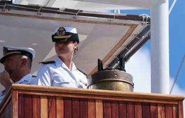 En la cubierta del buque saludaban los 76 guardiamarinas que integran este XCVII crucero de instrucción, entre ellos la princesa de Asturias
