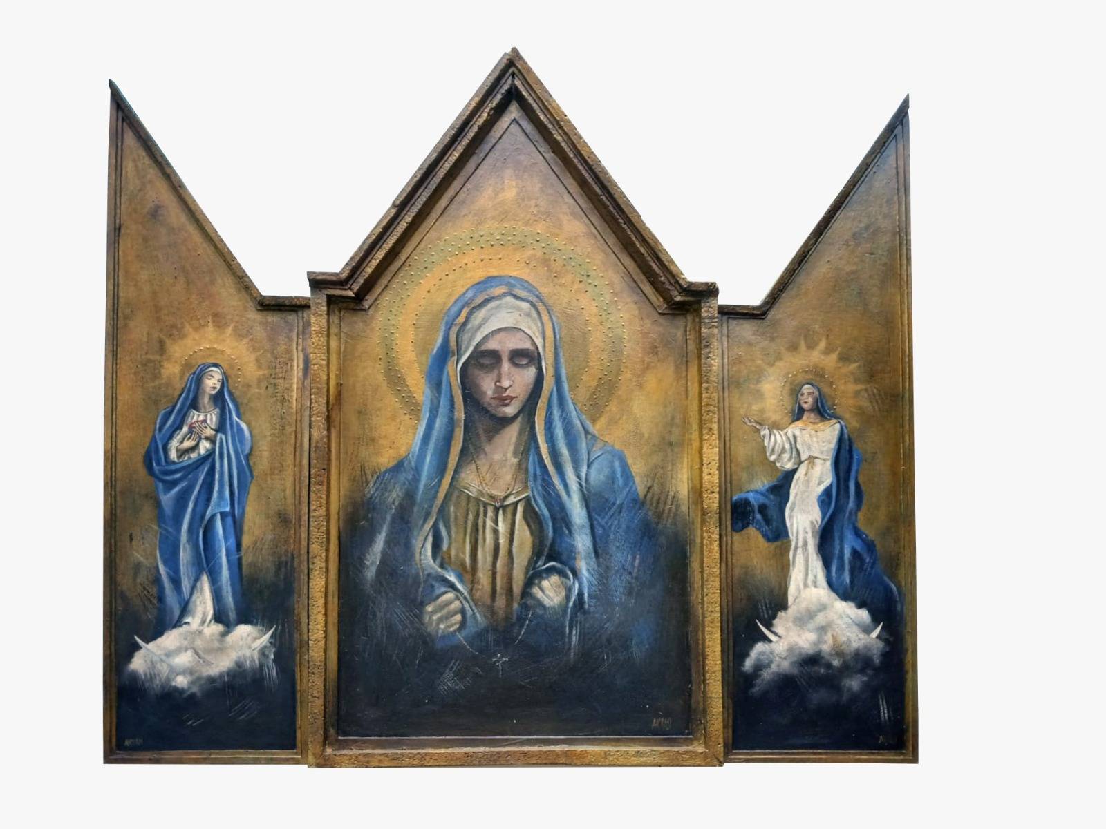 Las figuras alargadas representadas por el artista se inspiran en el arte gótico y en los mosaicos bizantinos. Sus colores, donde predominan el dorado de lo sagrado, el blanco de la pureza y el azul del cielo y la virginidad, nos crean una sensación de profunda paz y nos hacen volver a sentir la protección del regazo materno. Simbólicos ángeles, banderas y palomas también comunican al espectador su mensaje de amor.