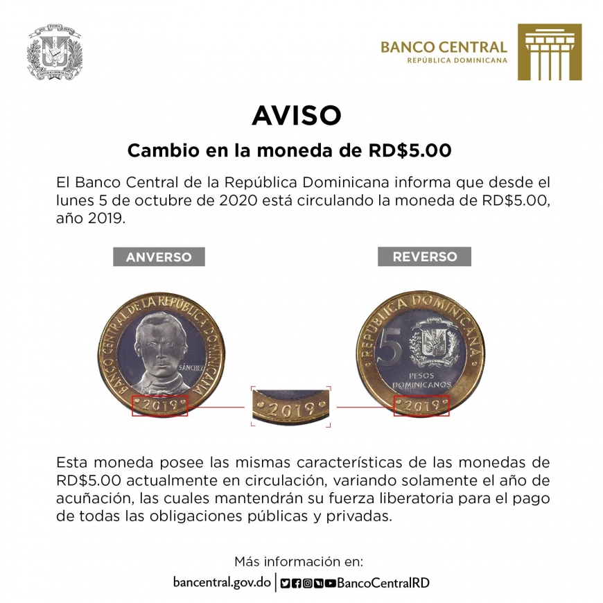 “Desde el lunes 5 de octubre del 2020 está circulando la moneda de RD$5.00 del año 2019″, informó el BCRD.