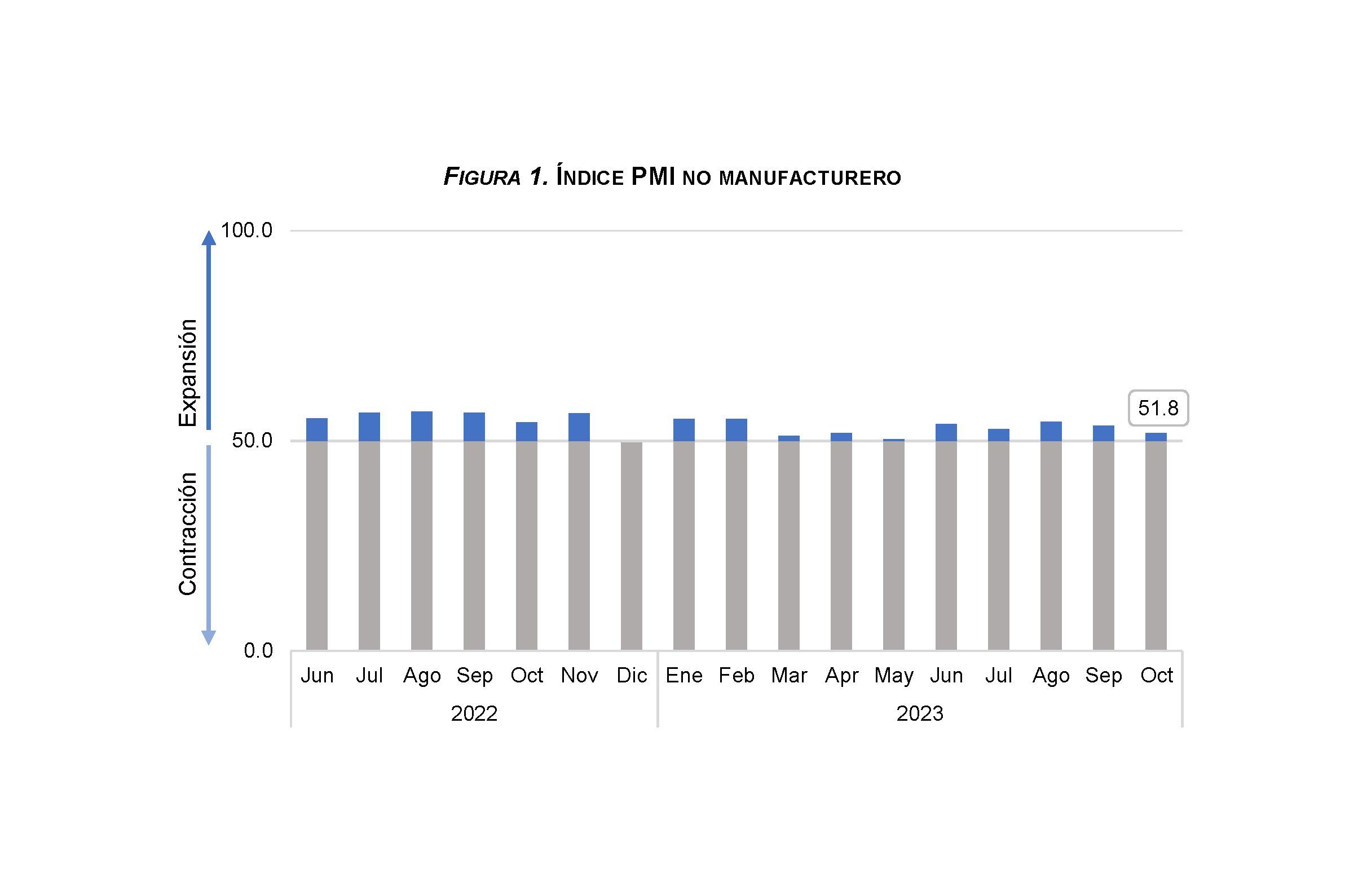 Por un lado, el desempleo general del país norteamericano se ubicó en 3.9 %, manteniéndose en los niveles observados antes de la pandemia. Adicionalmente, el índice de gestores de compras (PMI por sus siglas en inglés) no manufacturero del Instituto de Gerencia y Abastecimiento (ISM por sus siglas en inglés) registró un valor de 51.8 en octubre, evidenciando la sostenida expansión del sector servicios,