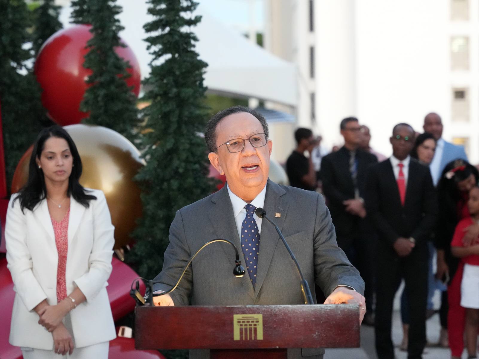 Acompañó al gobernador su esposa Fior D’Aliza Martínez de Valdez; la vicegobernadora Clarissa de la Rocha de Torres; el gerente, Ervin Novas Bello; el contralor José Manuel Taveras Lay; el subgerente general Frank Montaño, entre otros colaboradores, componiendo así un espíritu fraternal en la familia bancentraliana que, como todos los años, llenó las inmediaciones del Belén y el árbol navideño para celebrar la venida de la Navidad.