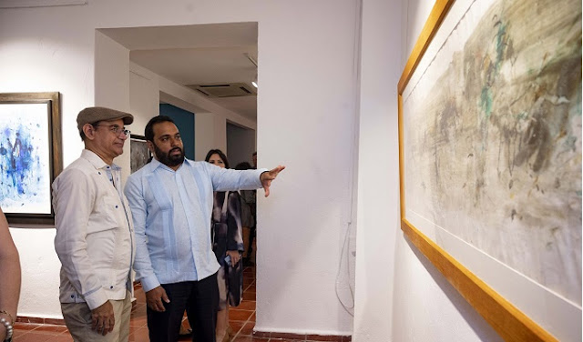 Mijail Peralta Rodriguez muestra la obra de Vicente Pimentel en la apertura de la exposicion del artista, en Centro Cultural Banreservas.
