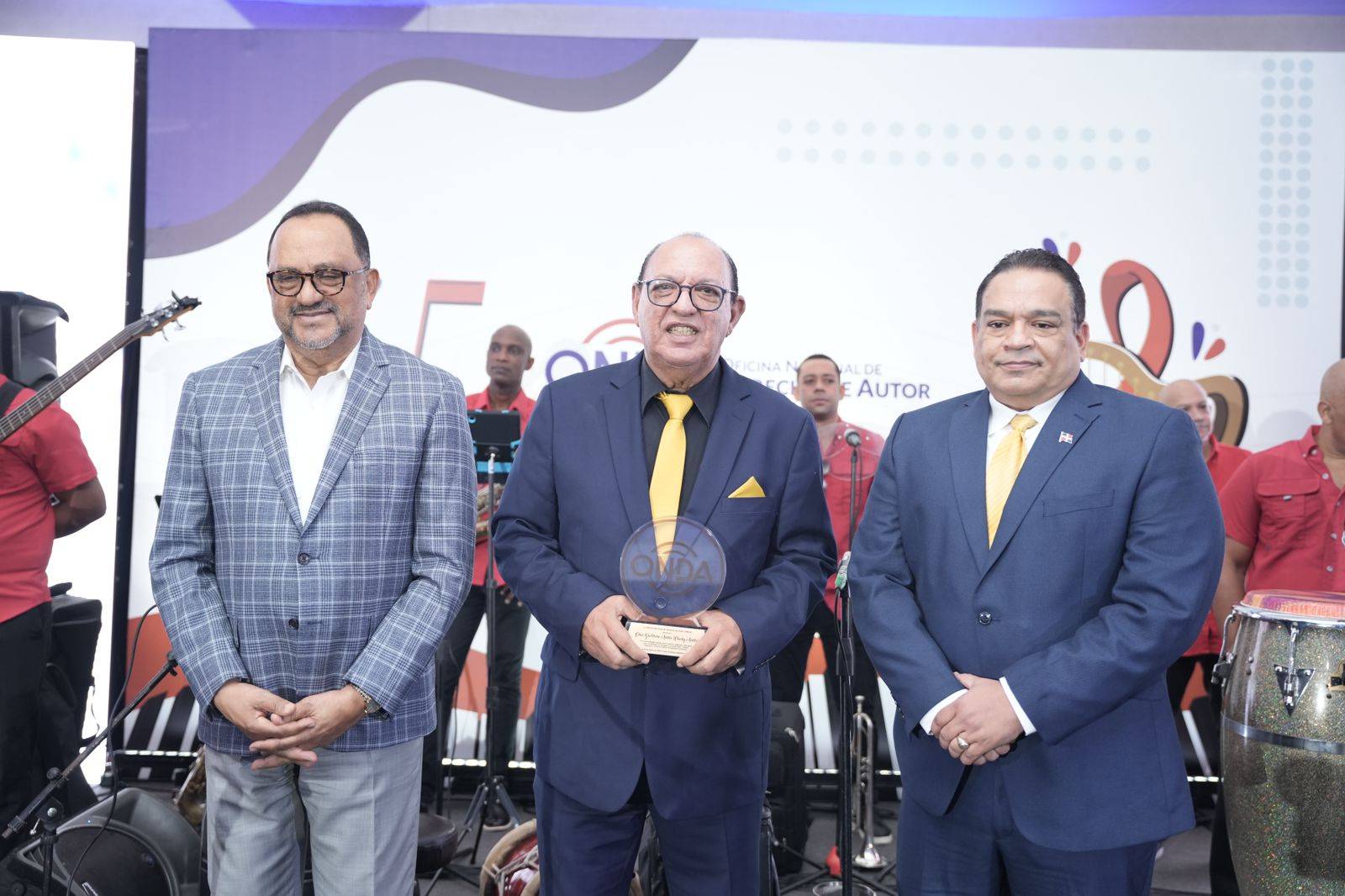El consultor jurídico del Poder Ejecutivo, Antoliano Peralta y el director de la ONDA José Rubén Gonell Cosme, entragan la placa a Chucky Acosta.