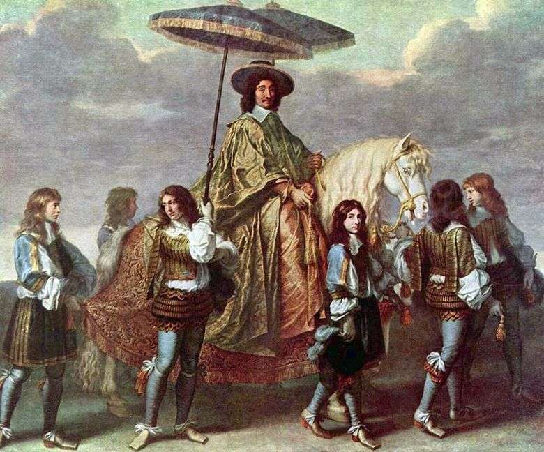 está montado a caballo el ya nombrado cortesano. Su figura realza por su tamaño, en tanto los servidores que le rodean aparecen minimizados en tamaño e importancia.