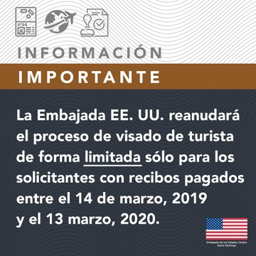 «La Embajada de los Estados Unidos reanudará el procesamiento limitado de visas de turista. Se les dará prioridad a aquellos solicitantes cuyos recibos de la tarifa MRV se pagaron entre el 14 de marzo de 2019 y el 13 de marzo de 2020».
