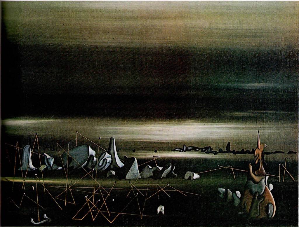 Ives Tanguy, en “Cita de las paralelas”, se vincula a un surrealismo abstracto, penetrando en otros mundos, que recuerdan las costas vírgenes después de los tsunamis y remedan dimensiones espacio-temporales diferentes, donde las paralelas pueden converger en un universo alucinante.