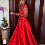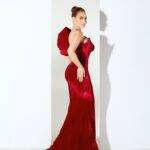 El vestido, una creación del diseñador vietnamita Guyen Tien, tiene un corte de sirena de color rojo pasión con una sola manga que le da un aire estiloso y a la vez muy atractivo.