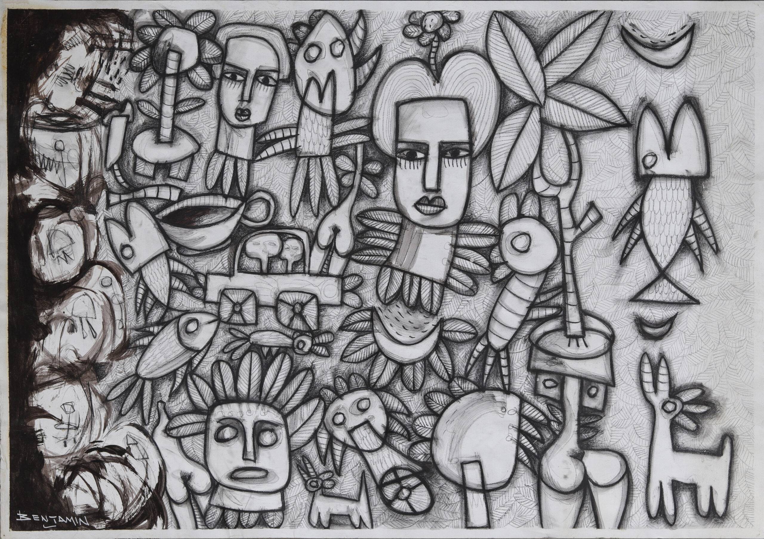 Sobre matrices variadas como el cartonite, el papel fabriano, el cartón reciclado, el lienzo, Benjamín va dejando sus huellas, a veces con la monocromía de un dibujo, otras conformando áreas irregulares con colores que contrastan espacialmente, estableciendo diferentes profundidades a través del uso de tonalidades cálidas y frías.