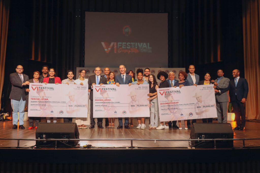 En la categoría Teatro, la Universidad Iberoamericana (UNIBE) obtuvo el primer lugar, con la obra “El tango de Dada”, el segundo fue para la Pontificia Universidad Católica Madre y Maestra (PUCMM), con “Las danzas” y el tercer lugar lo ganó el Instituto Cultural Dominico Americano (ICDA) con la obra “Elvira”, del dominicano Américo Lugo, quienes recibieron igual monto en premios que la categoría anterior. Todas las categorías ganadoras recibieron, además, un trofeo y un certificado de participación.