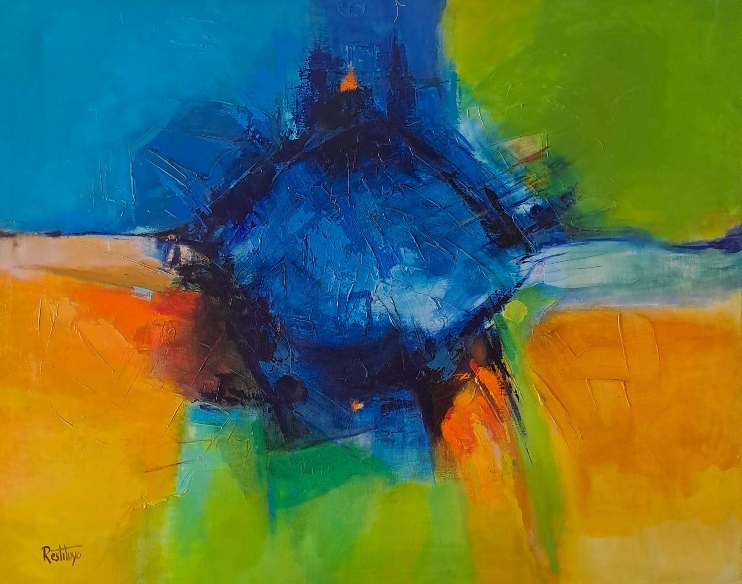 Al borde de un abismo de fuego, sobre aguas de roja intensidad, las casitas azules donde anidan todos los sueños se sostienen por la magia del arte de un Ricardo Restituyo, creador de espacios, de nuevas realidades. Entre tanto, lo figurativo retorna, se expresa en los instrumentos sonoros que son portadores de la más abstracta de las manifestaciones artísticas: la música. Y salta el merengue a alegrar la fiesta, a dar un sentido identitario a su universo pictórico.