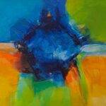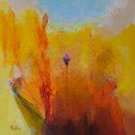 En los senderos de sus creaciones, se desliza la mirada desde los amarillos hasta sus complementarios violetas, se eleva una flor frágil y firme, delicada como el espíritu que todo lo salva y lo vence, se levantan los montes de una cordillera no nombrada, mientras una paloma azul anida y rompe los cuatro puntos cardinales convirtiéndose en