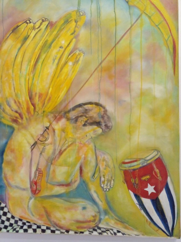Sus personajes alados aparecen recogidos, con los ojos cerrados, en meditación o descanso, buscando dentro de sí mismos la abundancia, la felicidad, la Patria, el amarillo del sol deslumbrante del Caribe, ese que tiñe de matices la cáscara de oro de esa fruta que alimenta nuestro cuerpo, reflejando el alma del trópico fecundo del que somos parte.