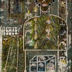 En este espacio de sueños y utopías, un ave del paraíso deposita huevos de esperanza, las formas geométricas se reflejan en el perfil de la mirada, una máquina colorida danza con una marchanta y un águila levanta el vuelo ante la mirada insomne de una Humanidad tallada.
