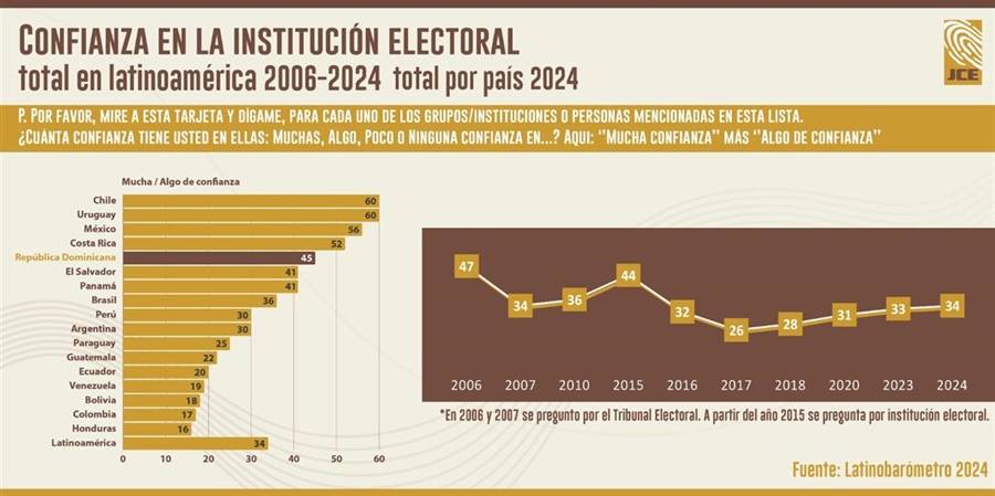 El informe de Latinobarómetro 2006-2024 sitúa a la Junta Central Electoral (JCE) de República Dominicana como la quinta institución electoral de la región en donde hay más confianza y la sexta entre los que piensan que las elecciones son limpias.