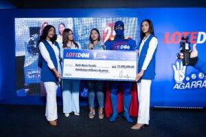 Foto 1. Ruth Maria Peralta recibe su premio de 25 millones de pesos del Agarra 4 de Loetedom. Le acompañan Yamer Ruiz, dos edecanes y el personaje de Super Lotedom.