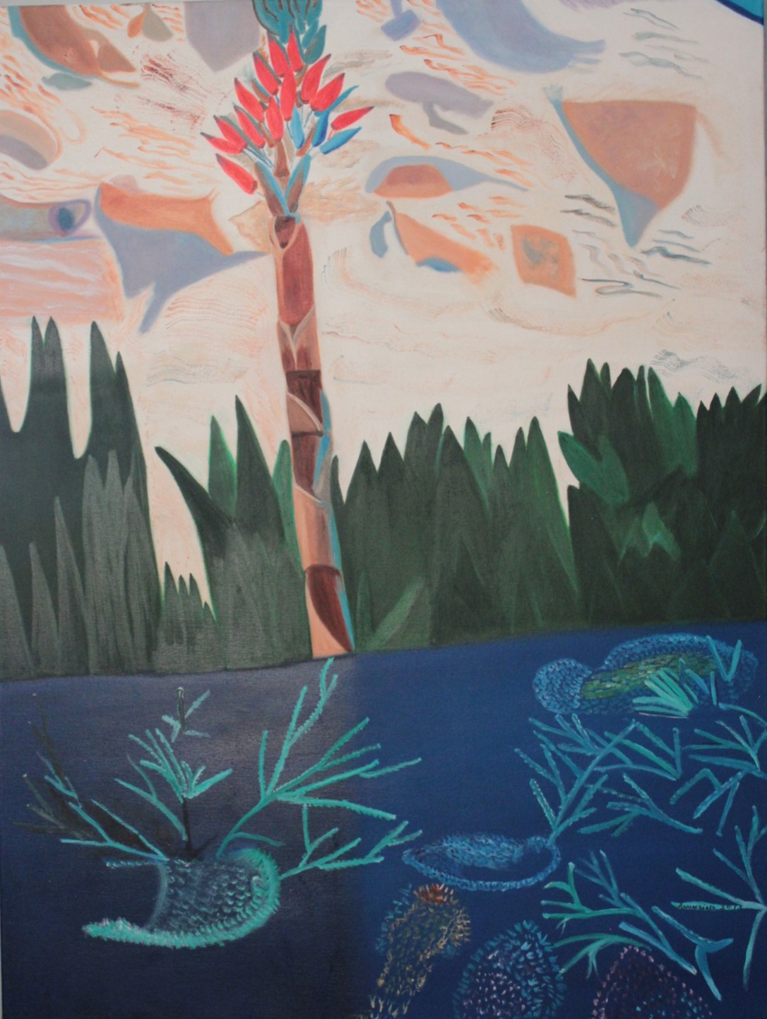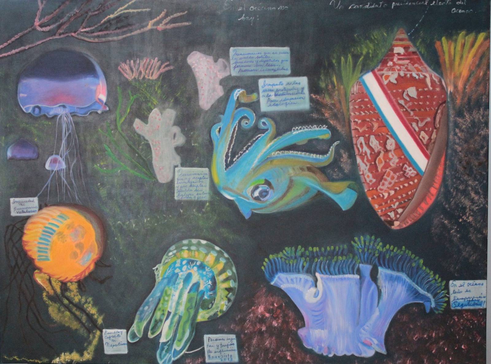 Su arte, cargado de ternura y lirismo, explora un entorno natural, fundamentalmente marino, dedicando especial atención a la reinterpretación artística de peces, corales, y estrellas de mar. También muestra las flores y los frutos de la tierra, expresando la posibilidad de una relación sostenible entre el ser humano y el ambiente que le rodea.