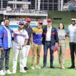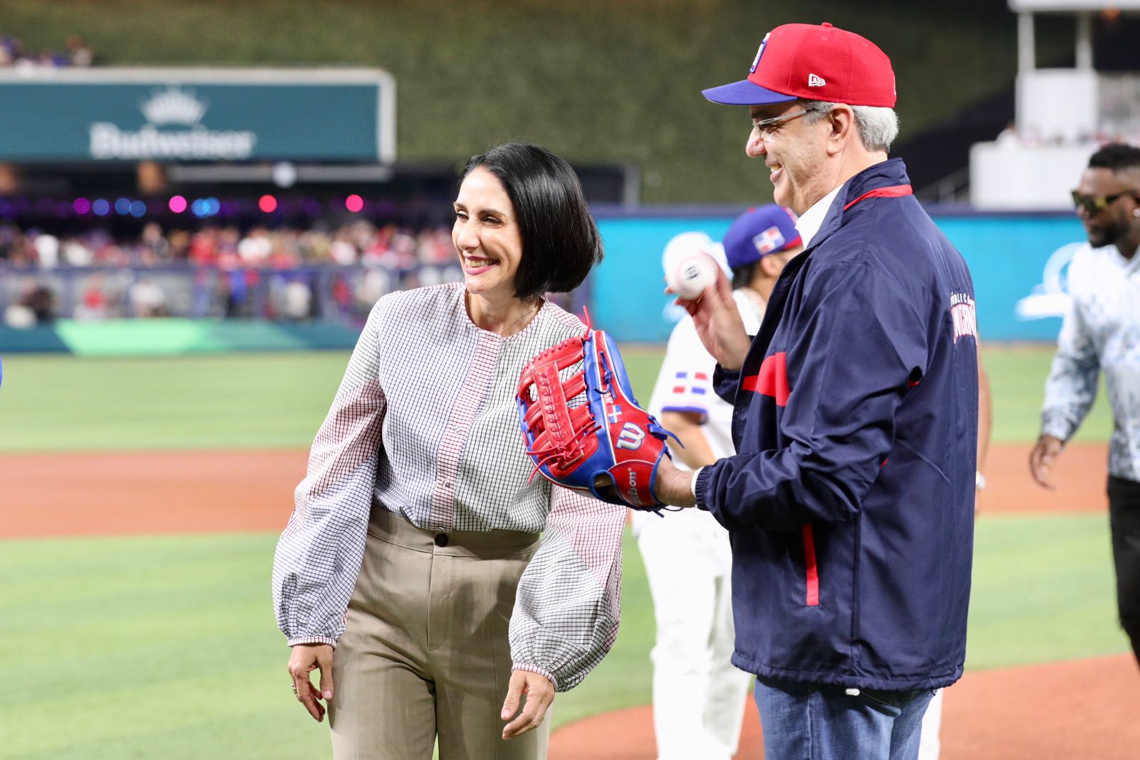 Acompañaron al gobernante en el montículo la primera dama Raquel Arbaje, los salones de la fama Pedro Martínez y David Ortiz y el exjugador de Grandes Ligas Albert Pujols. El exponente de música urbana, El Alfa, entregó la bola al presidente Abinader.