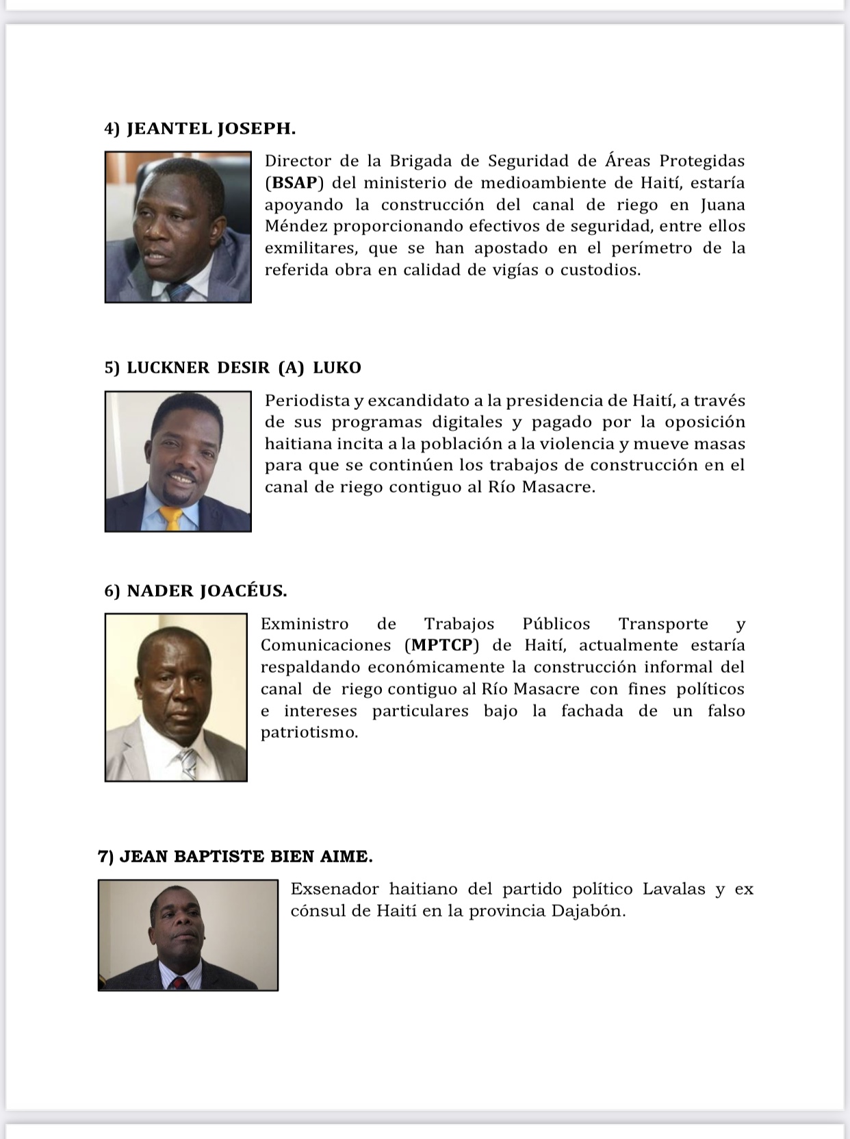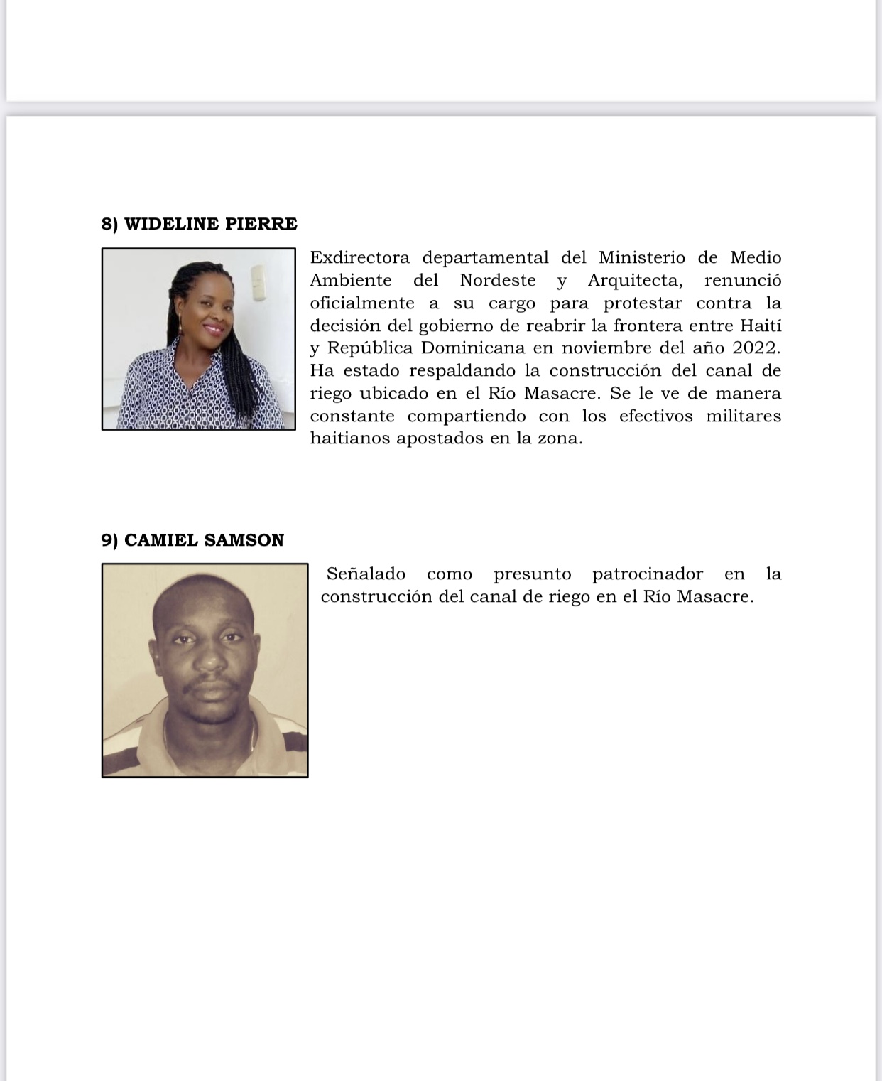 Asimismo a Wideline Pierre; exdirectora departamental del Ministerio de Medio Ambiente del Nordeste y Arquitecta y Caniiel Samson, señalado como presunto patrocinador en la construcción del canal de riego en el río Masacre.